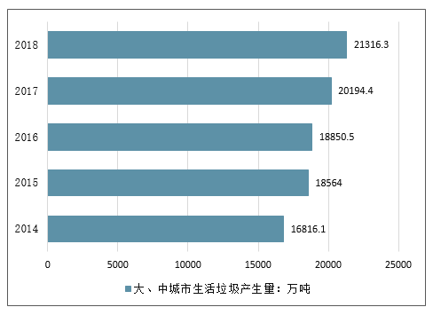 2014-2018年全國大、中城市生活垃圾產(chǎn)生量情況